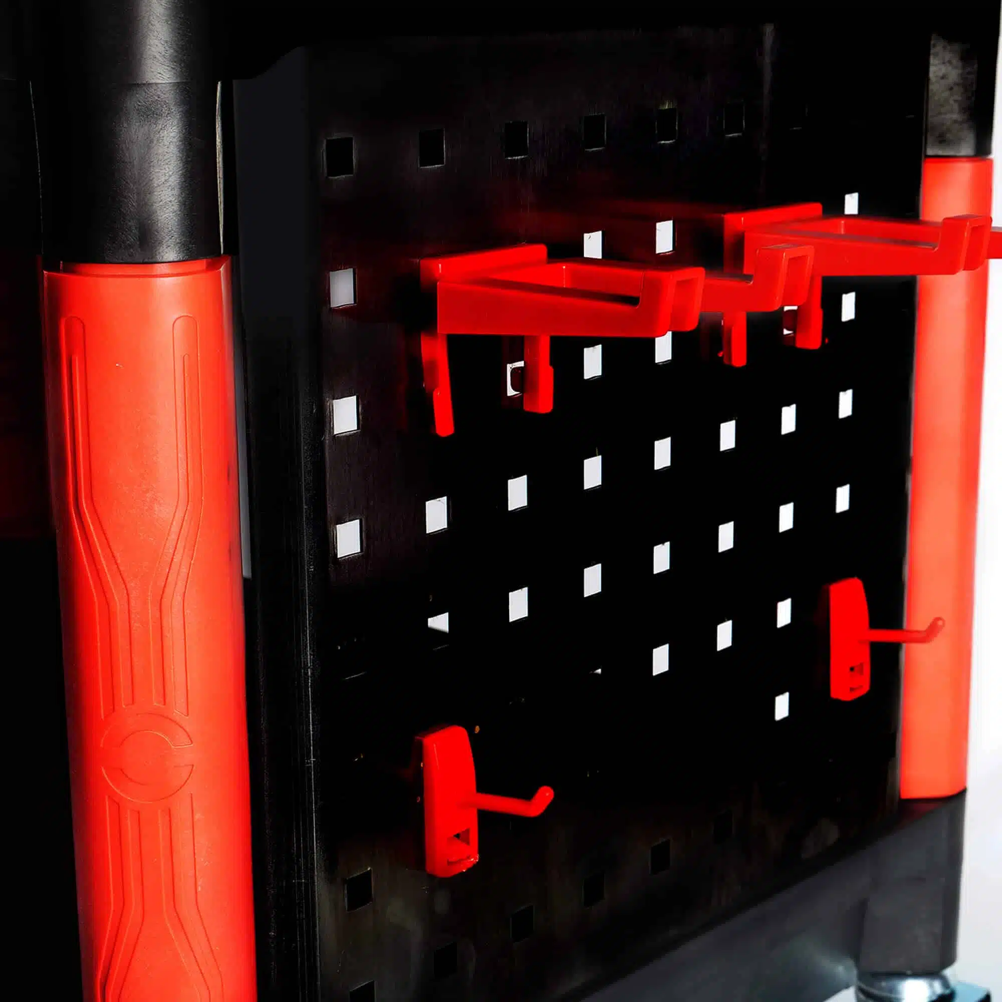 Duas placas laterais com gancho de 12 peças para manter as ferramentas à mão.